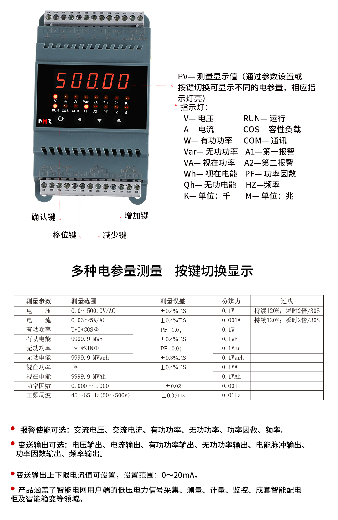 虹潤公司是專(zhuān)業(yè)生產(chǎn)電流傳感器的國家專(zhuān)精特新“小巨人”企業(yè)。生產(chǎn)的單相電量變送器,具有多種電參數測量,有功無(wú)功電能累積,高抗干擾,導軌壁掛共用, RS485/RS232通訊等特點(diǎn)。產(chǎn)品獲得基于一種交流信號變送器、交直流信號轉換電路、基于DCS技術(shù)的盤(pán)裝式三相電量表等3項國家發(fā)明專(zhuān)利,主持起草工業(yè)過(guò)程控制系統用模擬輸入兩位或多位輸出儀表國家標準,直流漏電流傳感器規范、通信系統多通道數據采集控制終端規范等2項軍用標準,以及現場(chǎng)設備集成等5項智能制造國家標準,參與國際5G標準制定,取得單相電量?jì)x表等2項相關(guān)軟件著(zhù)作權。產(chǎn)品廣泛應用于電力、冶金、化工、水泥、造紙、新能源、基礎設施等用電密集行業(yè)。