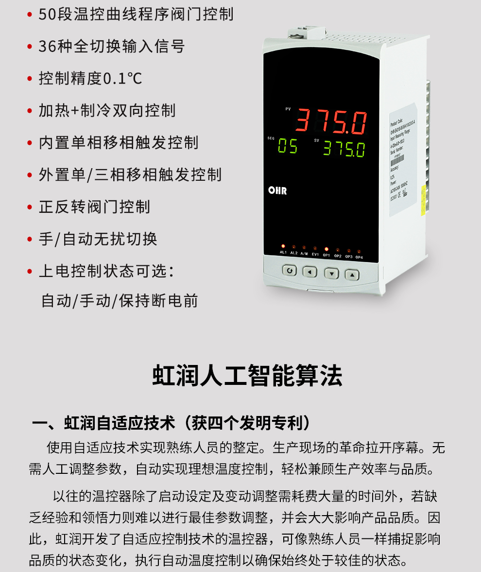 虹潤公司是專(zhuān)業(yè)生產(chǎn)溫控器的國家專(zhuān)精特新“小巨人”企業(yè)。生產(chǎn)的程序閥門(mén)溫控器,具有50段溫控程序控制,真正人工智能算式,無(wú)需人工整定參數,控制精度可達±0.1°C,加熱制冷雙向控制等特點(diǎn)。產(chǎn)品獲得模糊PID控制儀及控制方法、人工智能調節器、智能化控制器、移相觸發(fā)控制器、閥門(mén)自動(dòng)手動(dòng)無(wú)擾動(dòng)操作控制方法及裝置等5項國家發(fā)明專(zhuān)利,主持起草智能溫度儀表通用技術(shù)條件、工業(yè)過(guò)程控制系統用模擬輸入兩位或多位輸出儀表、工業(yè)過(guò)程測量和控制系統用智能調節器等3項國家標準,,以及通信系統多通道數據采集控制終端規范軍用標準,參與國際5G標準制定,取得增強型分段調節器等3項相關(guān)軟件著(zhù)作權。產(chǎn)品廣泛應用于電力、石化,冶金、制藥、食品等幾乎所有工業(yè)現場(chǎng),實(shí)現精準控溫,保障生產(chǎn)安全與質(zhì)量。