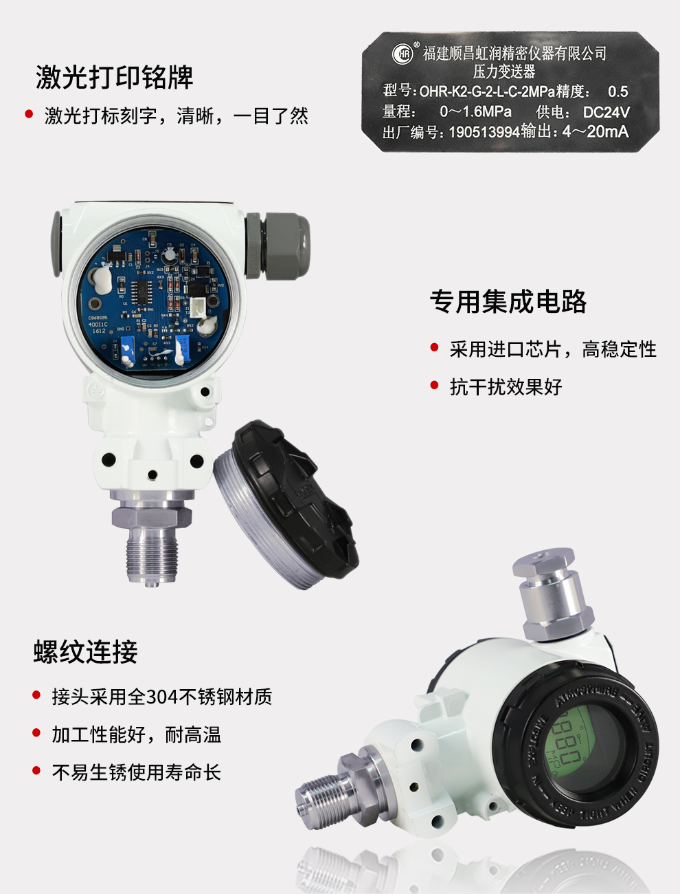 虹潤公司是專(zhuān)業(yè)生產(chǎn)壓力變送器的國家專(zhuān)精特新“小巨人”企業(yè),生產(chǎn)的擴散硅壓力變送器,具有精度高,穩定性好,響應速度快,高可靠性,抗過(guò)載和抗沖擊能力強,安裝方便等特點(diǎn)。產(chǎn)品獲得一種數字顯示低功耗壓力表、一種信號發(fā)生器裝置等2項國家發(fā)明專(zhuān)利,主持起草工業(yè)過(guò)程控制系統用模擬輸入兩位或多位輸出儀表、工業(yè)過(guò)程測量和控制系統用壓力/差壓變送器等2項國家標準,通信系統多通道數據采集控制終端規范軍用標準,以及現場(chǎng)設備集成等5項智能制造國家標準。參與國際5G標準制定,取得數顯壓力表等2項相關(guān)軟件著(zhù)作權。產(chǎn)品廣泛應用于化工、食品、制藥、電力、設備配套、供暖、水處理、樓宇等行業(yè),需精準測量流體壓力的現場(chǎng)。