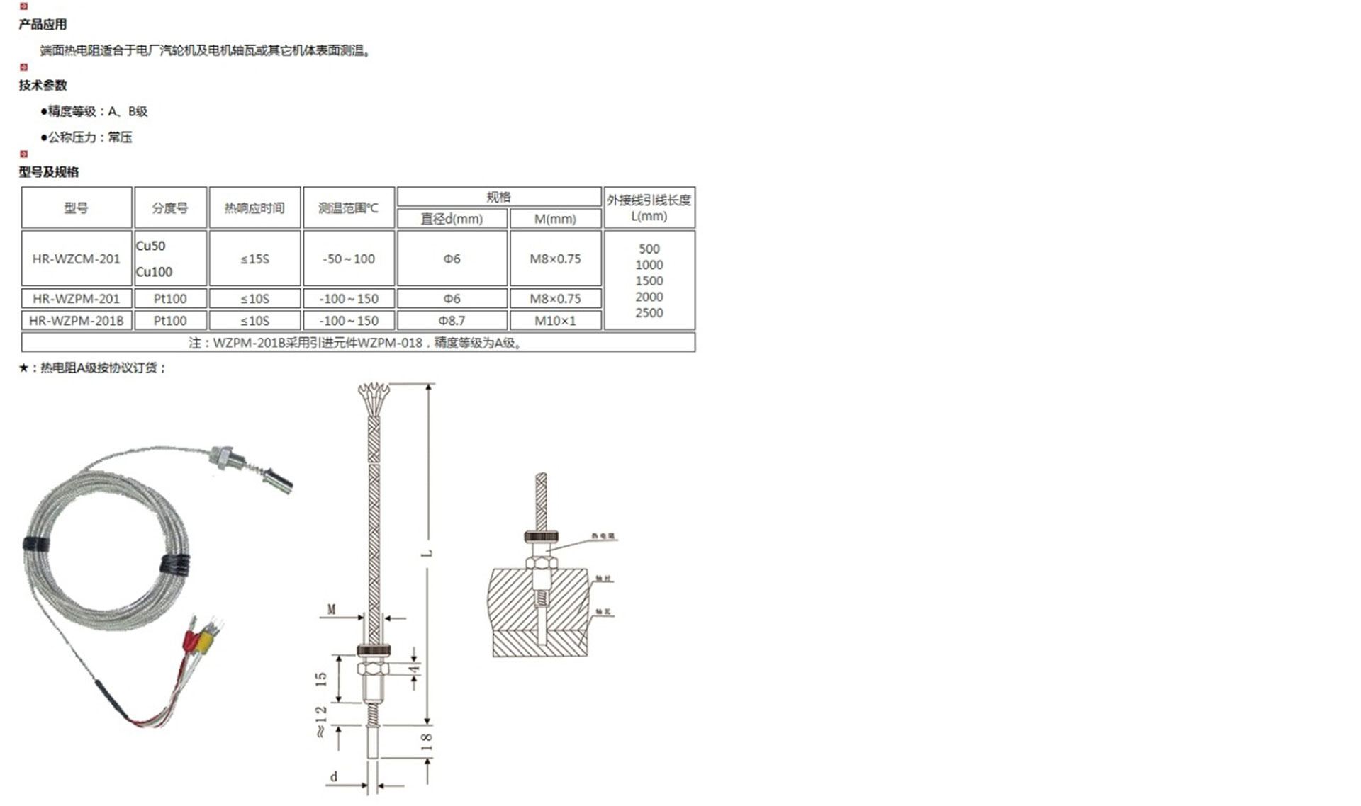 端面熱電阻元件由特殊處理的絲材(銅或鉑絲)繞制,它們緊巾在溫度計前端,與一般軸向熱電阻相比,端面熱電阻能更正確和迅速地反映被測端面的實(shí)際溫度狀況,它的制作方法很多,品種形式多樣,適合于電廠(chǎng)汽輪機及電機軸瓦或其它機體表面測溫。