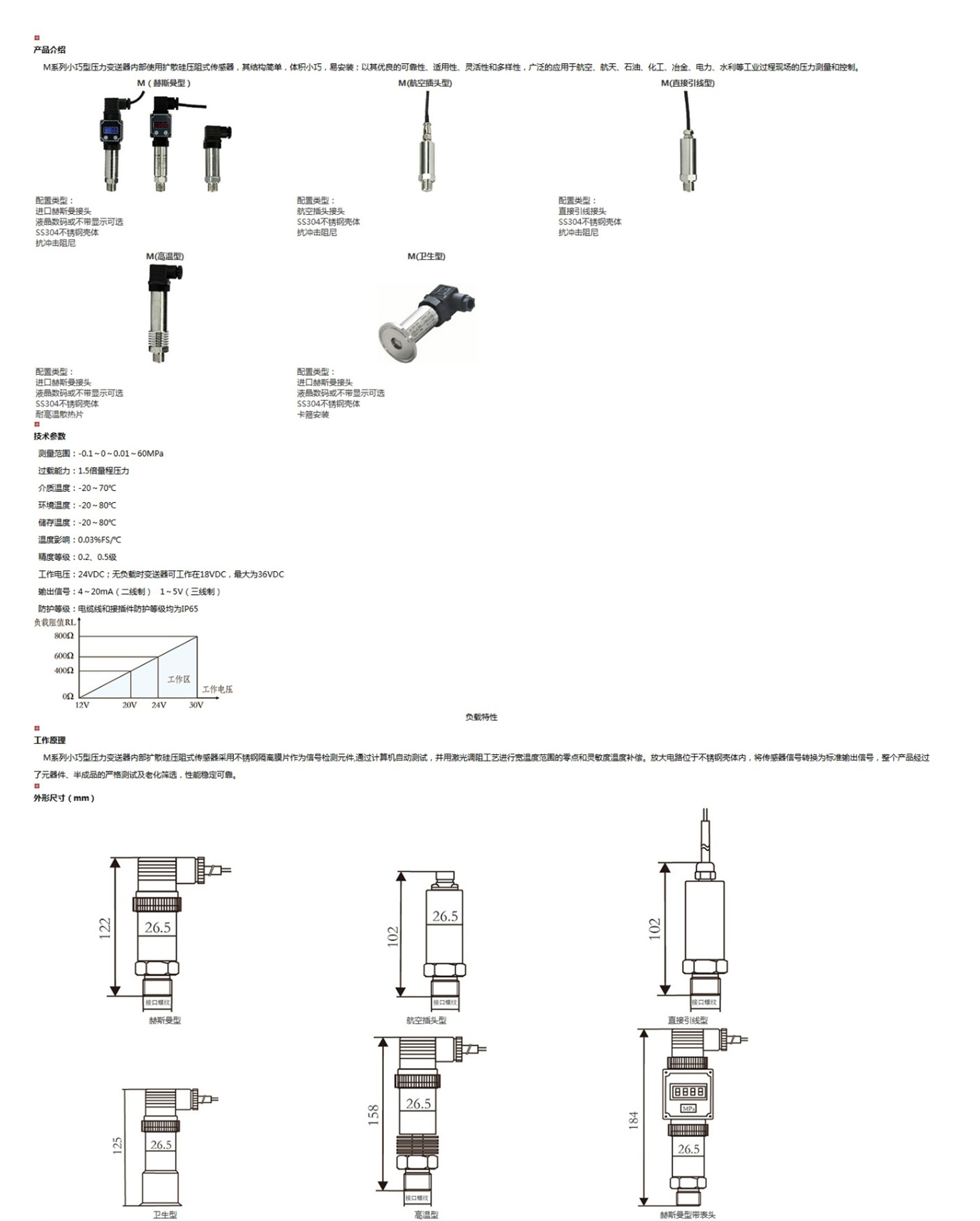 M系列小巧型壓力變送器內部使用擴散硅壓阻式傳感器,其結構簡(jiǎn)單,體積小巧,易安裝;以其優(yōu)良的可靠性、適用性、靈活性和多樣性,廣泛的應用于航空、航天、石油、化工、冶金、電力、水利等工業(yè)過(guò)程現場(chǎng)的壓力測量和控制。