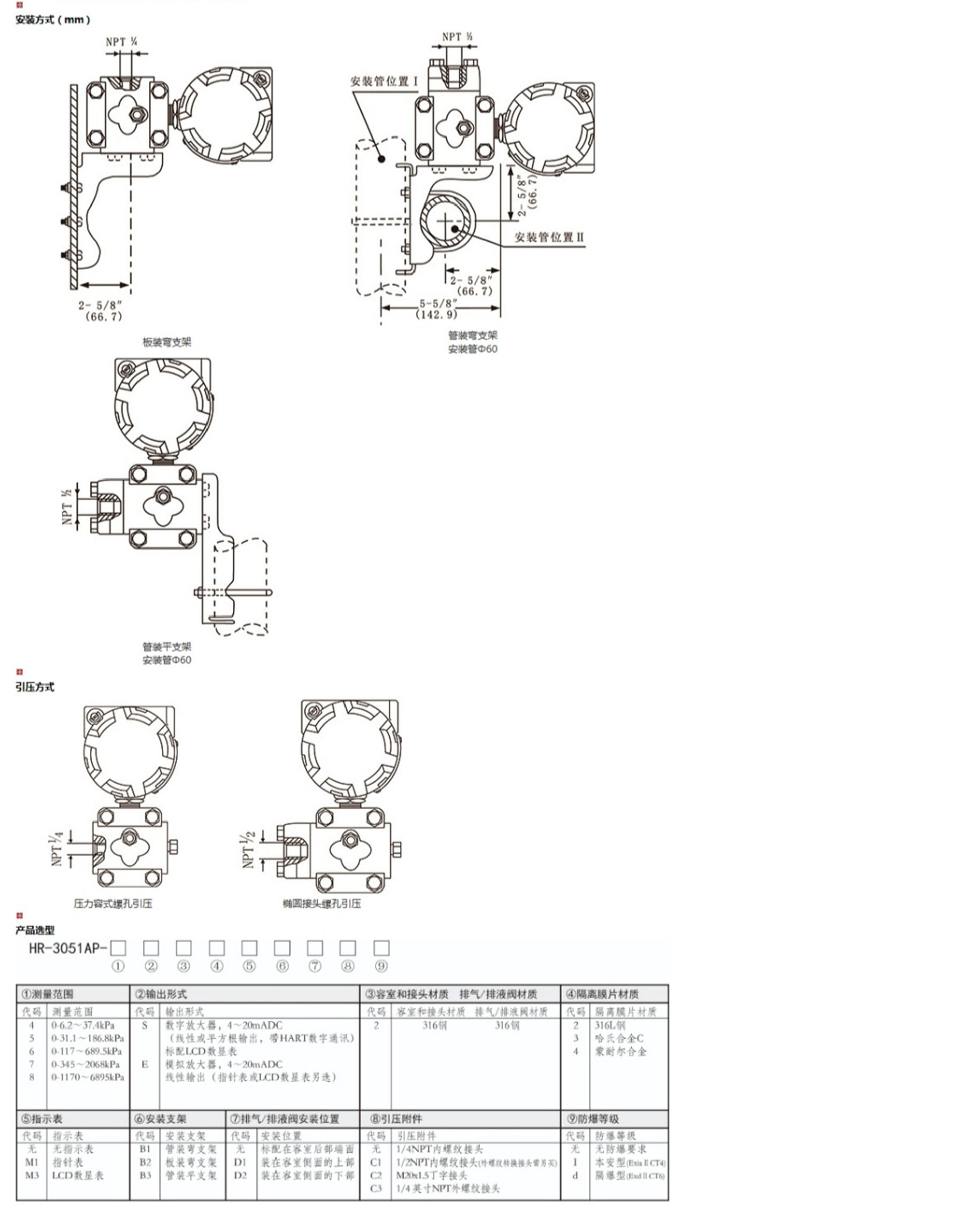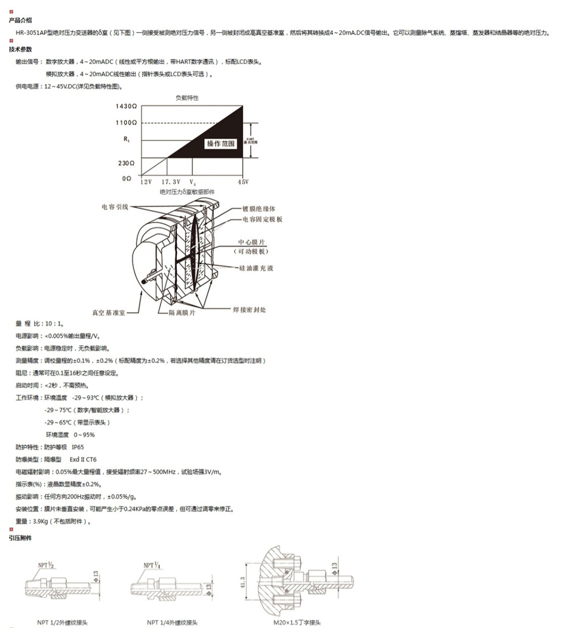 HR-3051AP型絕對壓力變送器的δ室(見(jiàn)下圖)一側接受被測絕對壓力信號,另一側被封閉成高真空基準室,然后將其轉換成4~20mA.DC信號輸出。它可以測量除氣系統、蒸餾塔、蒸發(fā)器和結晶器等的絕對壓力。