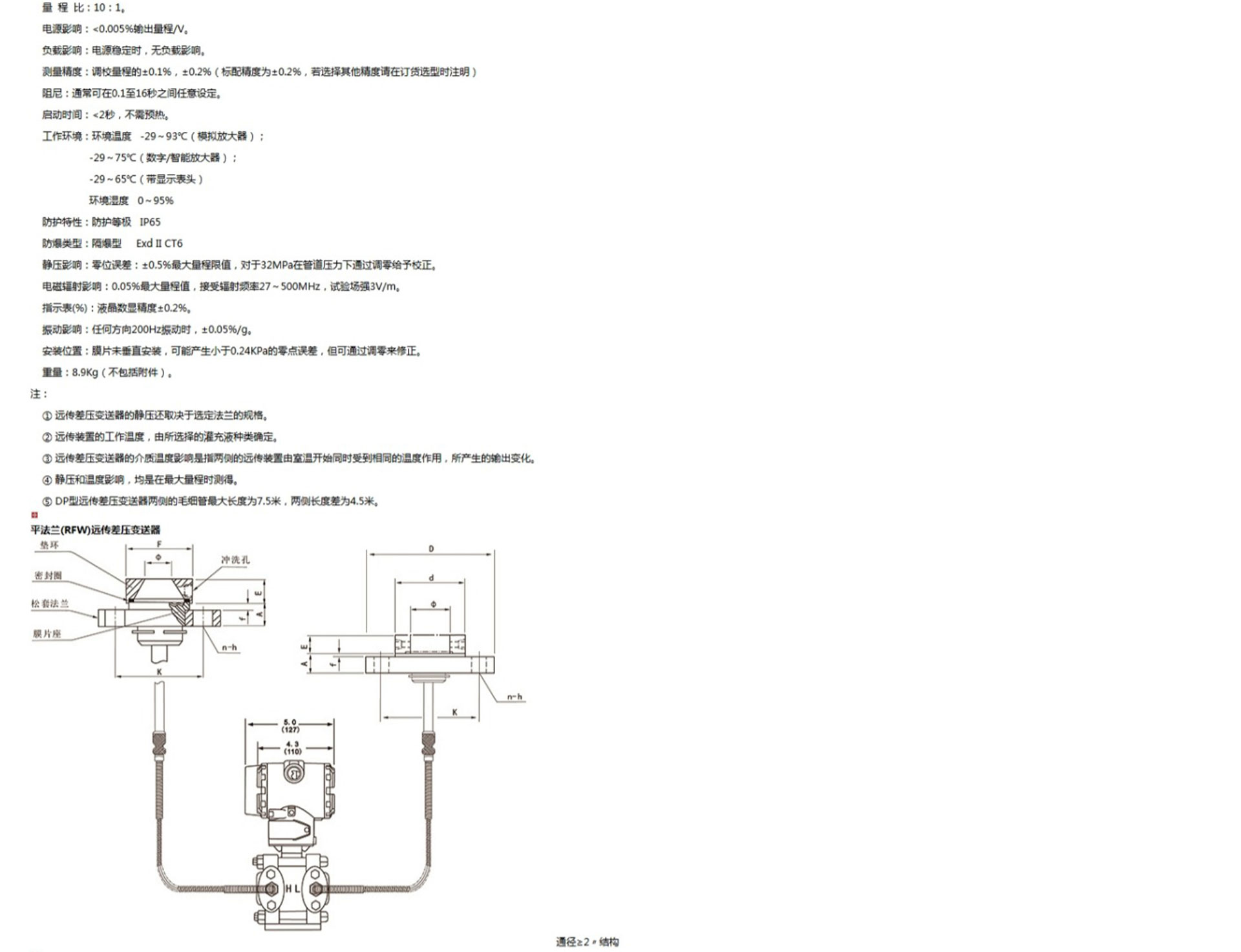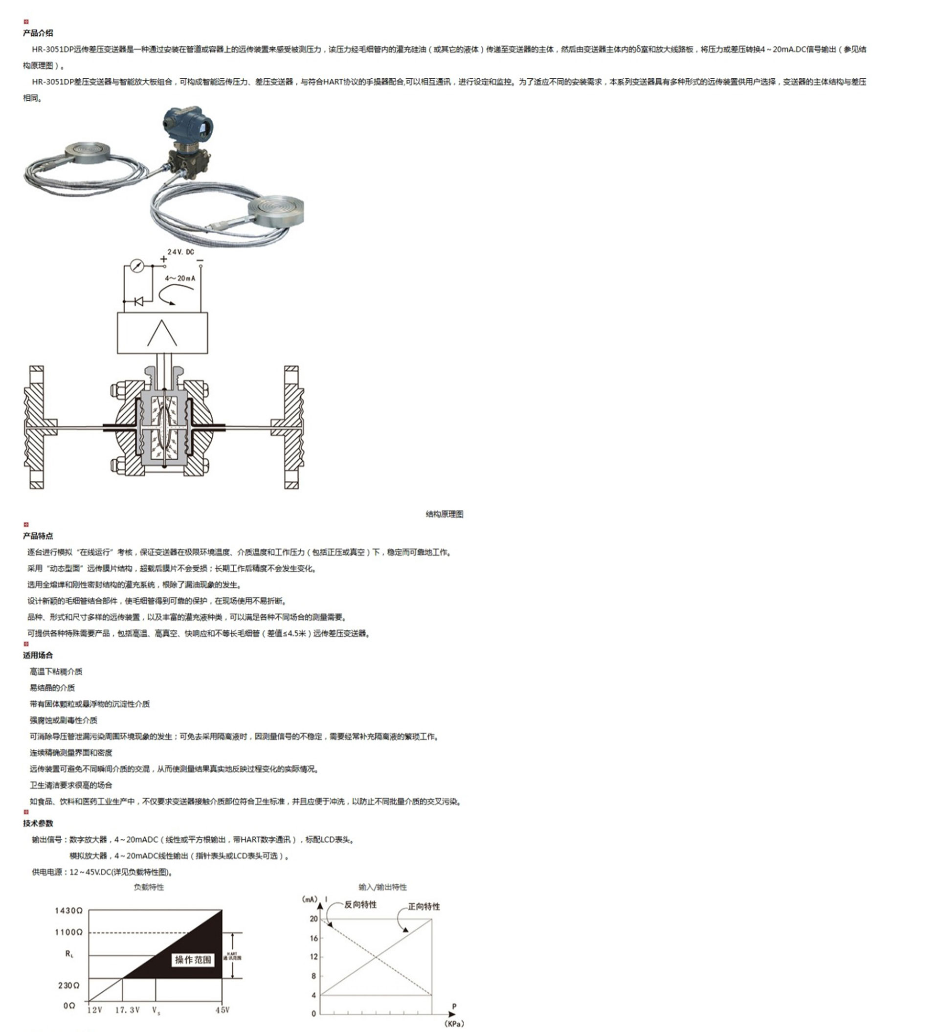 HR-3051DP遠傳差壓變送器是一種通過(guò)安裝在管道或容器上的遠傳裝置來(lái)感受被測壓力,該壓力經(jīng)毛細管內的灌充硅油(或其它的液體)傳遞至變送器的主體,然后由變送器主體內的δ室和放大線(xiàn)路板,將壓力或差壓轉換4~20mA.DC信號輸出。