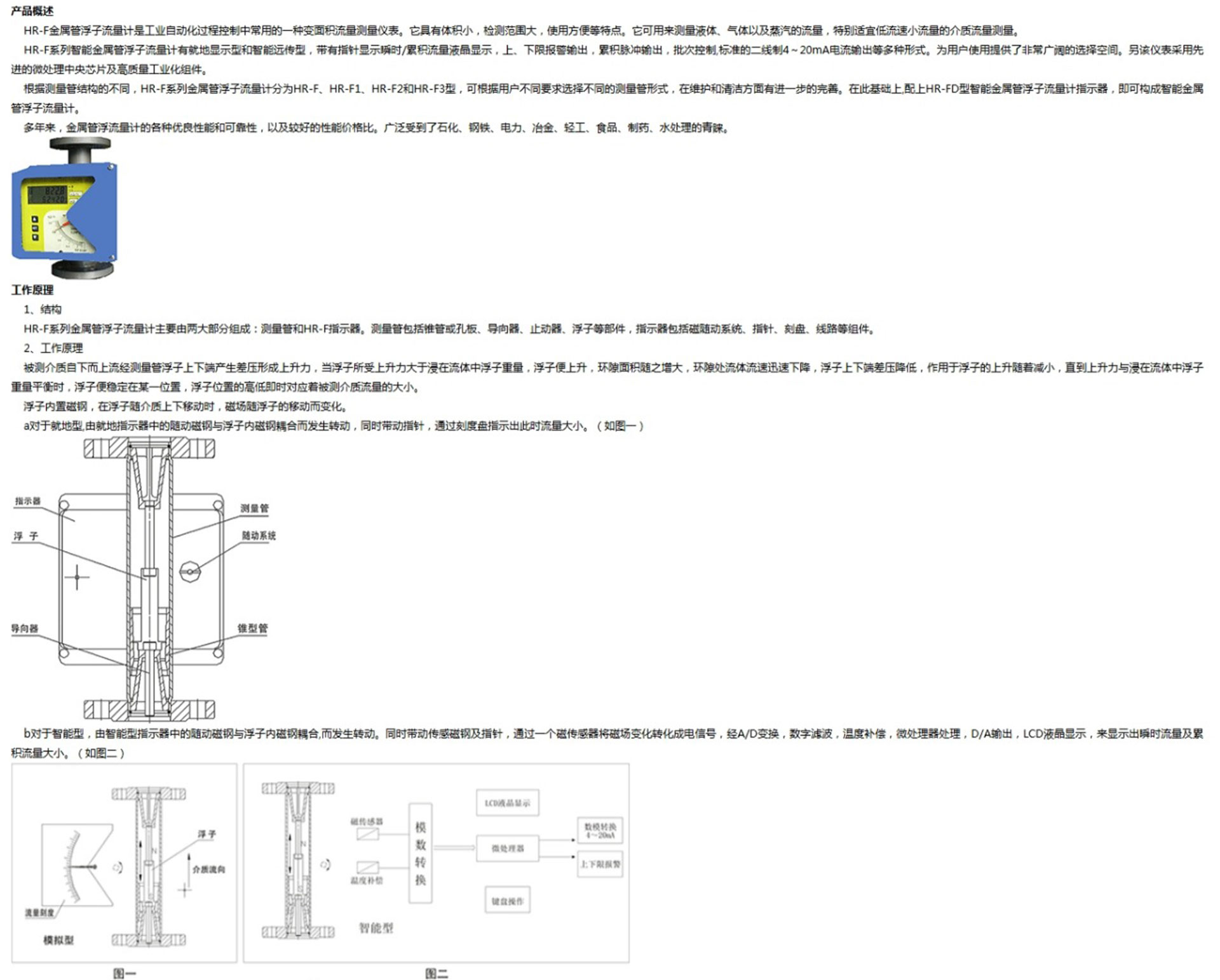 HR-F金屬管浮子流量計是工業(yè)自動(dòng)化過(guò)程控制中常用的一種變面積流量測量?jì)x表。它具有體積小,檢測范圍大,使用方便等特點(diǎn)。它可用來(lái)測量液體、氣體以及蒸汽的流量,特別適宜低流速小流量的介質(zhì)流量測量。
